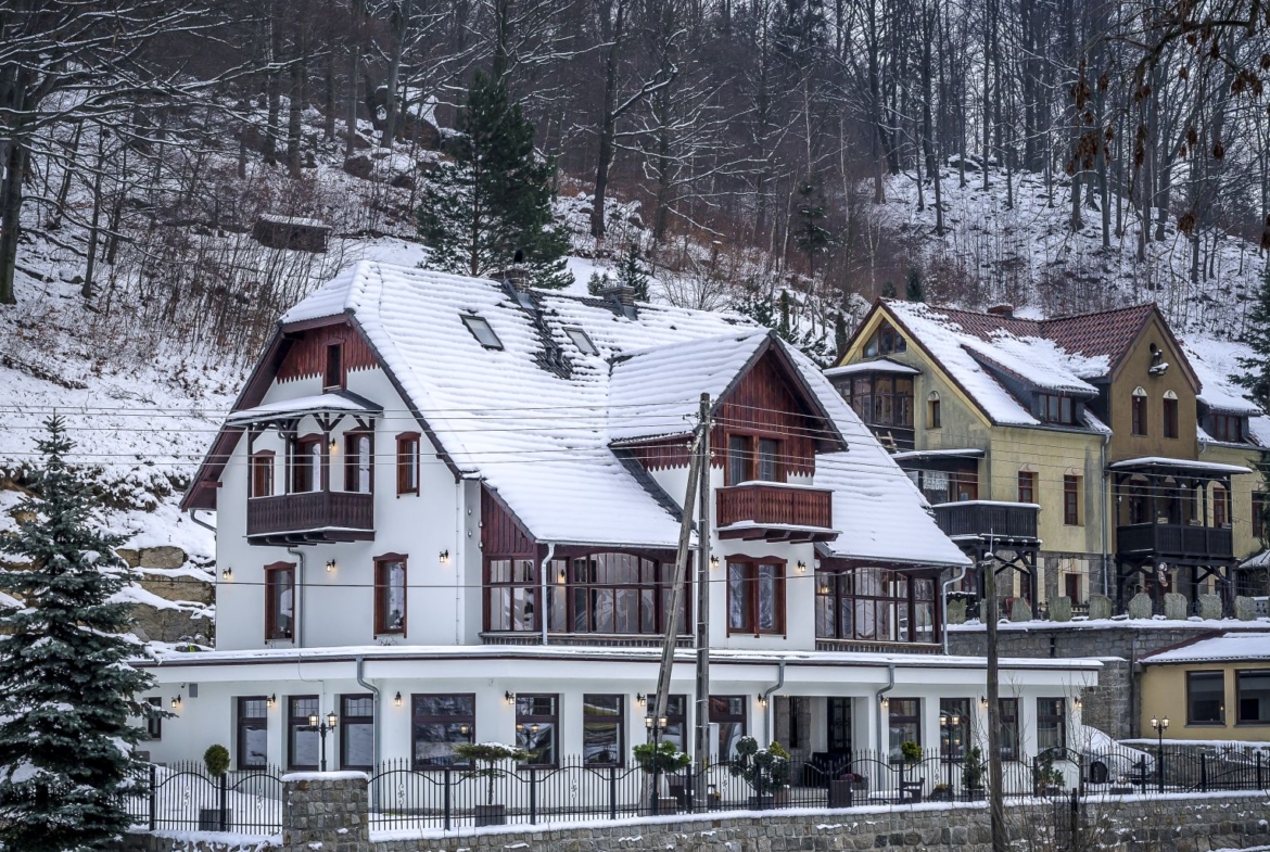 Do sprzedania piękny pensjonat w bardzo wysokim standardzie wykończenia. Doskonała lokalizacja tuż przy granicy Karkonoskiego Parku Narodowego, 30 minut od dworca kolejowego w Jeleniej Górze. Na dzień dzisiejszy do dyspozycji gości 22 miejsca noclegowe w pięknie wykończonych i umeblowanych pokojach z łazienkami oraz mieszkanie właścicieli składające się z dużego salonu z aneksem kuchennym, sypialni oraz łazienki z wanną i prysznicem. Na parterze dodatkowo restauracja, jazz bar oraz sala kominkowa. Wszystko kompleksowo wyposażone i na bieżąco użytkowane. Obok duża wygodna kuchnia z pełnym zapleczem, kuchnie gazowe, lodówki, chłodziarki, zamrażarki, kostkarki do lodu , spiżarnie, pomieszczenie na wina. Podczas generalnego remontu i adaptacji budynku pod prowadzoną działalność (remont zakończony w 2019) wymieniono wszystkie instalacje , zamontowano system ochrony p.poż. , czujniki dymu i hydranty z osobnym zasilaniem wody. Zainstalowano pompę ciepła, 3 duże zasobniki na ciepłą wodę oraz 2 piece gazowe. Przygotowana została również instalacja do generatora prądu. Teren na zewnątrz jest pięknie zagospodarowany a dodatkowo zbudowano duży garaż używany przez gospodarzy jako pomieszczenie techniczne i magazyn.